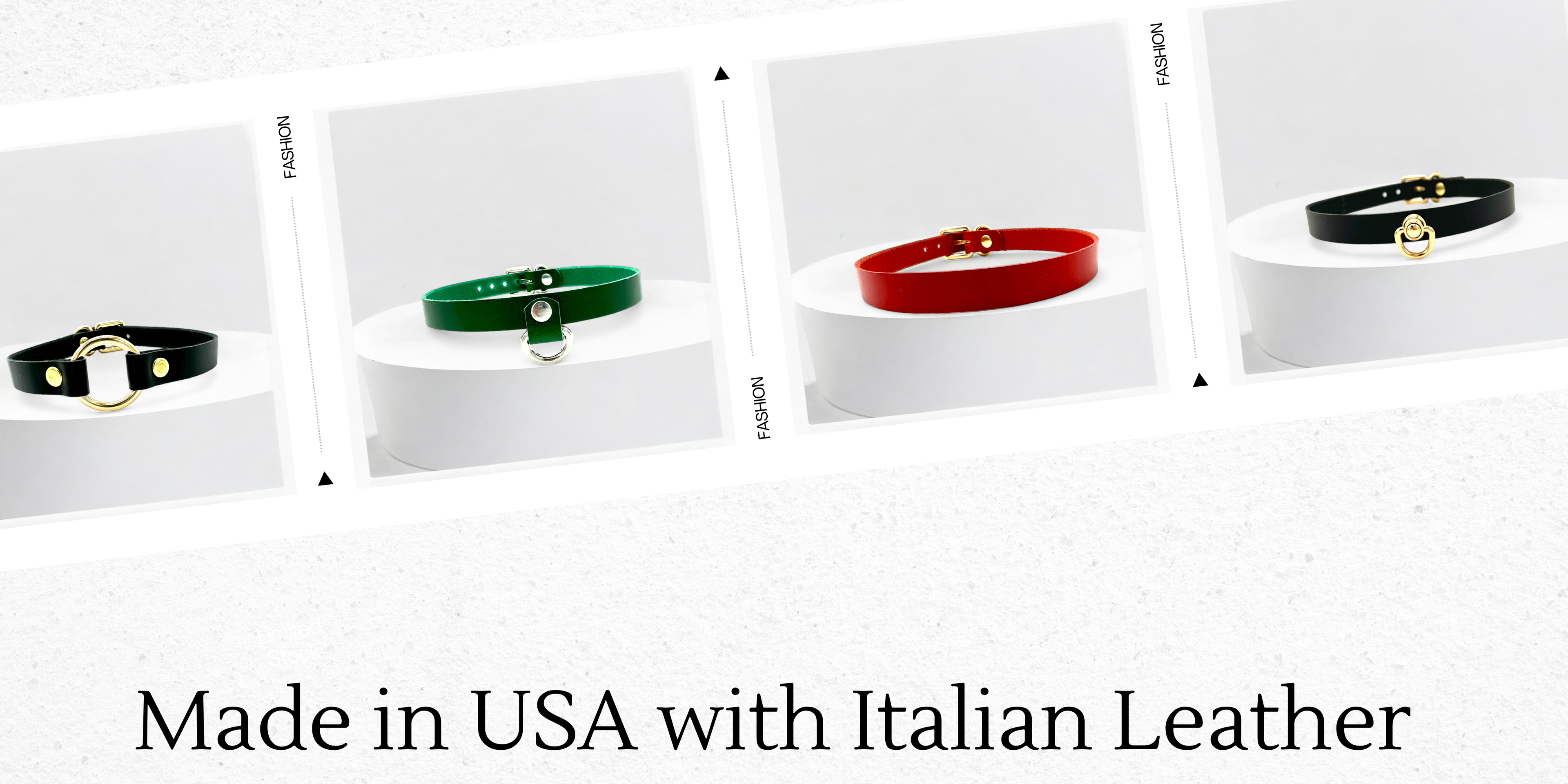 We use only luxury Italian leather and high-gloss patent leather to create our chokers. These materials are soft, durable, and naturally beautiful, giving each piece a unique look and feel. The patent leather offers a sleek, modern shine, while the vegetable-tanned leather develops a rich character over time.